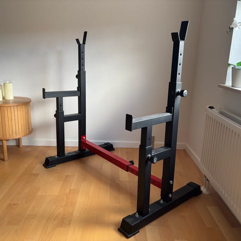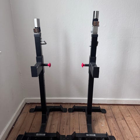 Squat Racket kan justeres i højden, så stangen kan placeres i flere niveauer. Egnet til øvelser som bænkpres, squat, skulderpres og andre styrketræningsøvelser med vægtstang. Passer til hjemmetræning, hvor der ønskes en simpel bænk og stativ til grundlæggende styrketræning.