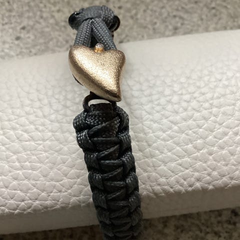 Dette armbånd er et støttearmbånd for familier til udsendte danske soldater, flettet i en kraftig snor og har en metaldetalje formet som et hjerte som lukning. Armbåndets diameter er Ø 7 cm, hvilket gør det passende til håndled af almindelig størrelse. Materialet ser robust ud og giver en enkel, men stilfuld udseende. Perfekt til både casual og mere formelle lejligheder. Tags: soldater, støtte-armbånd armbånd, flettet, sort, hjerte, zirkon. Nypris 750,-