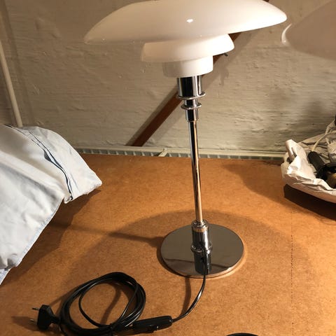 Den klassiske PH 3/2 bordlampe af Poul Henningsen for Louis Poulsen. Denne udgave med skærme af hvidt opal glas og sort metalliseret fod.