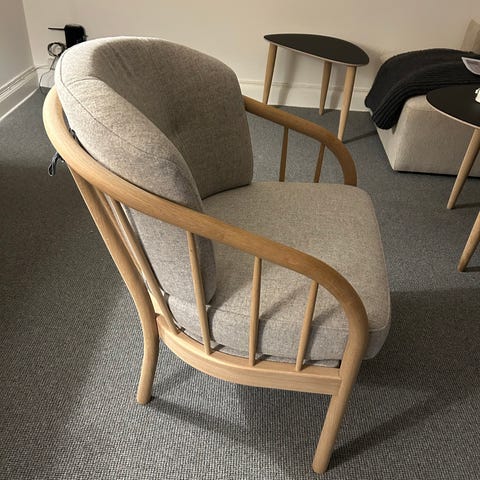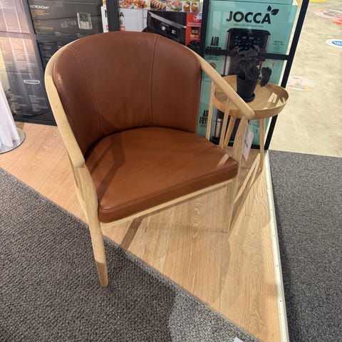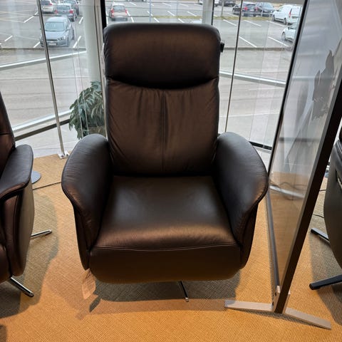 Stilren og tidsløs lænestol med skum i både sæde og ryg for en perfekt siddekomfort. Stolen er betrukket i deres slidstærke og behagelige cognacfarvede Viborg læder, og står på et stel i ubehandlet egetræ, der giver det komplete tidsløse look.