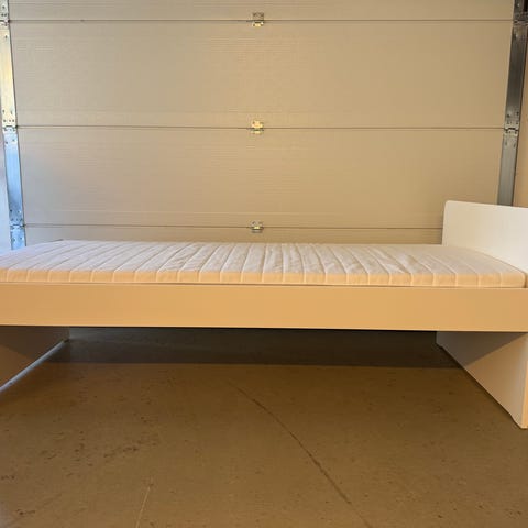 Sælger en pæn og velholdt enkeltseng bestående af IKEA-sengebund, god madras samt ekstra topmadras, der giver en mere luksuriøs og komfortabel liggeoplevelse.
