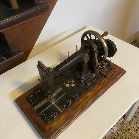 Symaskine monteret på træplade. Mekanisk model med svinghjul i metal og sort maskinkrop. Egner sig som brugsting for den kyndige eller som dekorativt indretningsobjekt. Producent og modelbetegnelse fremgår ikke tydeligt af maskinen.