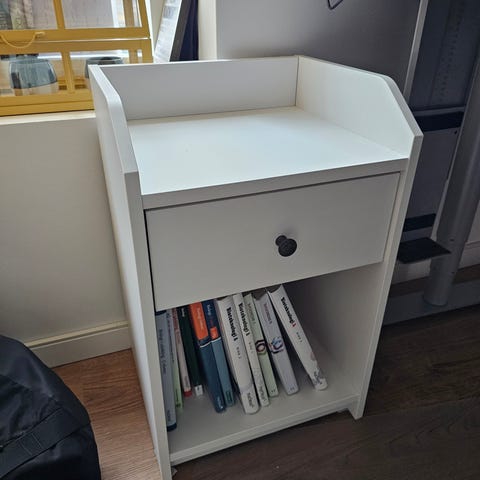 Har rille til ledning, så telefon og andet kan være i stik nede i skuffen