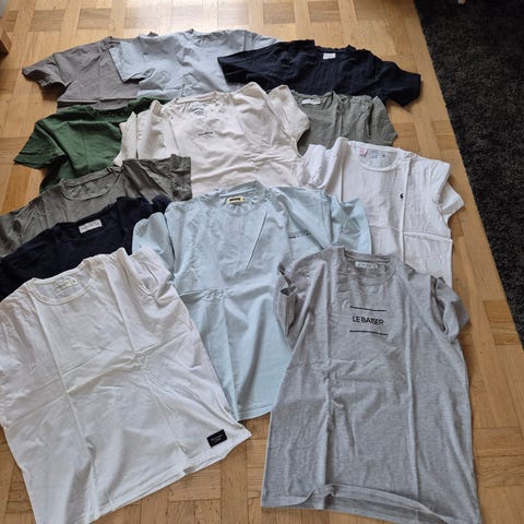 SÆLGER HER EN HEL PAKKE MED T-SHIRTS.