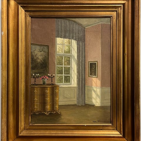 Interiør "Efteraarssol i stuen", Olie på lærred af William Henriksen (1880-1964)