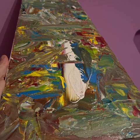 Maleri på lærred med regnbuens farve, malet af Ellen Madsen i 2014. Dette originale stykke kunst er flot farvestrålende maleri, er minimalistisk og abstrakt malet. Maleriet måler 80 x 80 cm, og er et kunstværk jeg har været rigtig glad. Kompositionerne er enkelte og strammere, og der er tale om et næsten grafisk udtryk, præget af lige linjer. Nu skal det moderne værk glæde en anden, som sætter pris på god billedkunst. Lærredet er signeret på bagsiden af kunstneren Ellen Madsen og der ligger også hendes visitkort. Prisen for dette flotte kunstværk er 450 kr.
