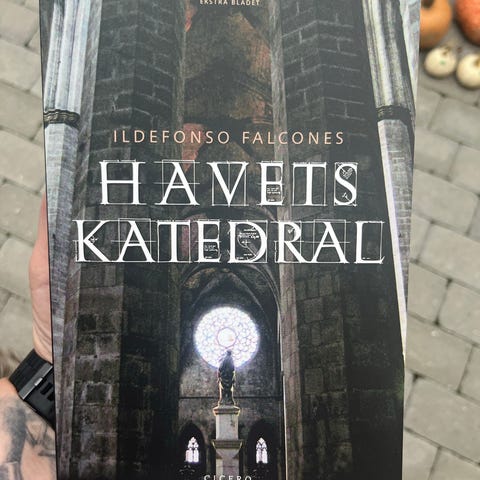 Ildefonso Falcones Havets katedral bog på dansk. Roman udgivet på Gyldendal, indbundet med hardback-omslag. Bogen foregår i middelalderens Barcelona og følger hovedpersonen Arnau gennem byens og katedralens opbygning. Teksten er på dansk, og bagsiden indeholder kort resumé af handlingen og oplysninger om forfatteren.