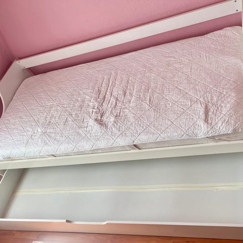 Fin junior seng i blå med sengehest som kan tages af efter behov. Der er to skuffer på hjul til opbevaring under sengen. Den er brugt og har ridser, men fungerer som den skal.