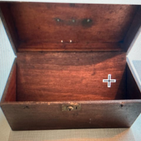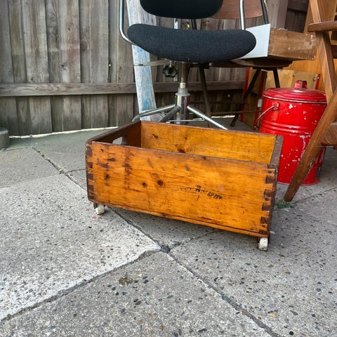 Kæmpe gammel trækasse med hjul, Kæmpe gammel trækasse fra Holmegaard og trykt pris på kr. 8 på, som den tilsyneladende har kostet i sin tid.