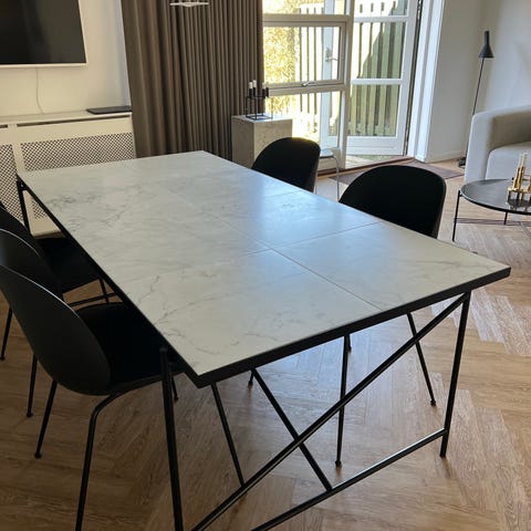 Smukt og stilrent spisebord fra Handwärk med bordplade i marmor og elegant hvid stålramme. Bordet er brugt, men i rigtig god stand og fremstår velholdt uden større brugsspor.