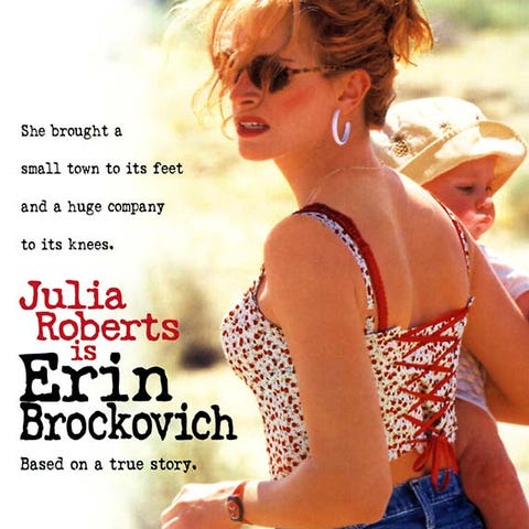 'Erin Brockovich' er den virkelige historie om en enkelt kvindes kamp mod en grundvands-forurenende kemigigant. Erin bliver skadet i en bilulykke og taber retssagen mod det fjols, der kørte over for rødt. Da Erin ikke har noget job og tre sultne børn, tigger hun sig til et job hos sin advokat. Det varer ikke længe, før hun falder over en stor forureningssag. Med mere end almindeligt gå-på-mod og begge batterier kørt godt i stilling går Erin i gang med at samle beviser mod den kemifabrik, der har udledt farlige kemikalier omkring fabrikken og derfor er skyld i flere menneskers sygdom og død.