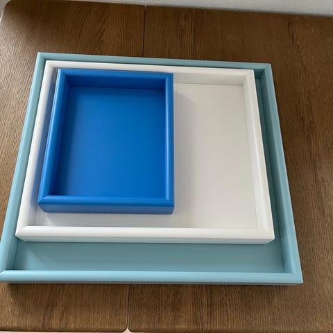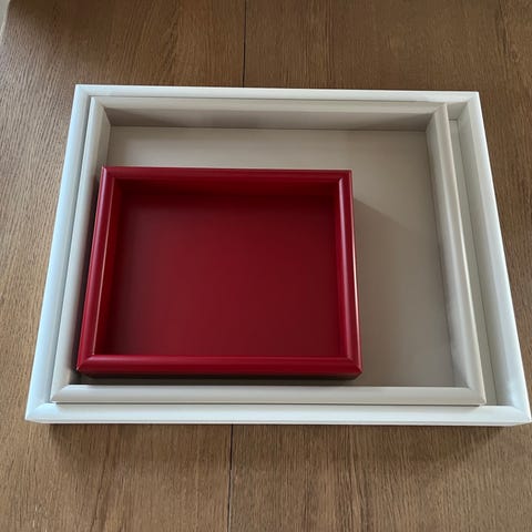 Montana bakker sæt i tre størrelser hhv. 44x35, 27,5x32,5 og 17x21 cm… dette sæt er nedsat i forhold til de andre, da den hvide bakke har et lillebitte tryk i et af hjørnerne der vender nedad.. så egentligt ikke noget der ses, men skal nævnes… ellers i ny stand