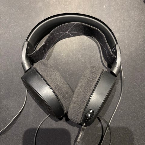 SteelSeries Arctis gaming headset med mikrofon i sort. Over-ear design med polstrede ørekopper og justerbar hovedbøjle med stofrem. Aftagelig eller fleksibel mikrofon monteret på venstre ørekop. Headsettet leveres med kabler og kontrolenhed som vist på billederne, egnet til brug ved computer eller konsol afhængigt af tilslutning.