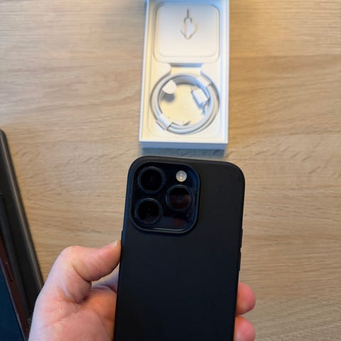 Apple iPhone 15 Pro med 128 GB. Modellen har stor skærm, tredobbelt bagkamera og frontkamera i skærmen. Enheden leveres med original æske og opladningskabel, som vist på billederne. Incl cover og panzerglas.