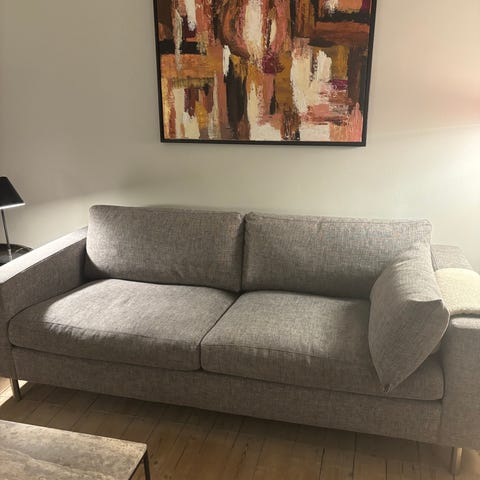 God sofa fra Bolia med betræk i lyst gråt uld. Rigtig god at sidde og ligge i men har tydelige brugsværdier. Vi bruger selv tæpper på sæderne.