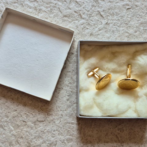 manchetknapper i forgyldt metal til mand. Klassiske knudeformede manchetknapper med drejelås, velegnede til skjorter med manchetknaphuller. Simpelt og tidløst design i guldfarvet forgyldning.