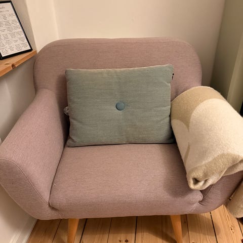 Fin lænestol med blødt betræk der ikke fejler noget. Kun benene er bestikke ellers er resten uskadt.