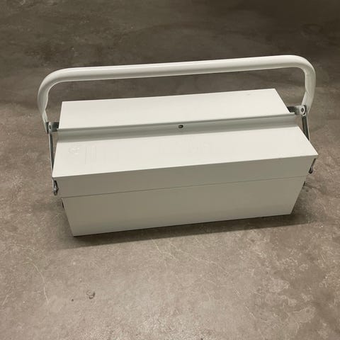 Toyo Y-350 værktøjskasse i metal. Rektangulær model med bærehåndtag på toppen og frontlås. Indvendigt er kassen enkel uden ruminddeling, med plads til værktøj eller andet udstyr. Farven er grøn, og kassen er egnet til opbevaring i værksted, garage eller hjemmet. Aldrig brugt!