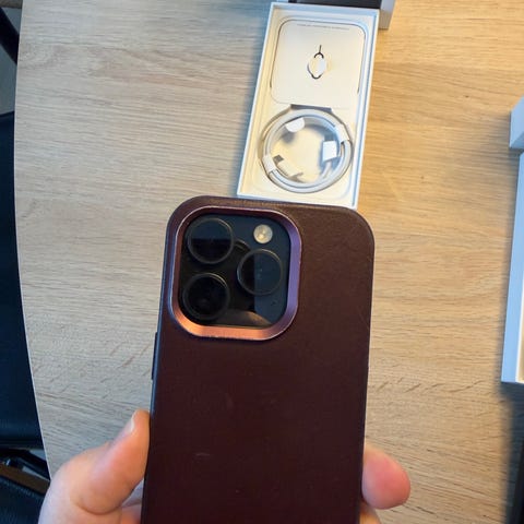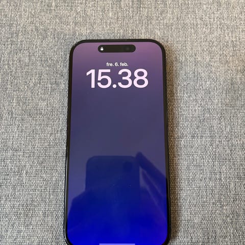 Apple iPhone 15 Pro med 256 GB blå. Modellen har stor skærm, tredobbelt bagkamera og frontkamera i skærmen. Enheden leveres med original æske og opladningskabel, som vist på billederne. Incl cover og panzerglas.
