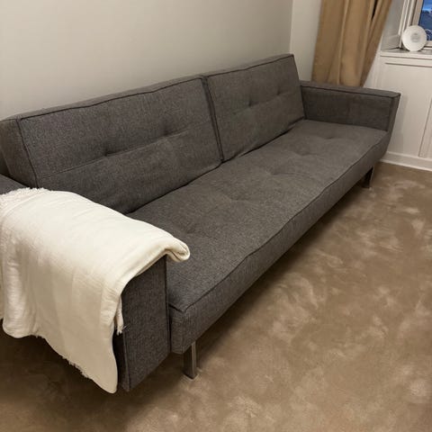 Som vist på billederne har der været undsluppet kanin der har bidt i kanten på magasin stoffet. Det kan ikke ses hverken i sofa eller senge tilstand. Men der er selvfølgelig taget højde for skaden i prisen.