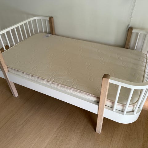 Juniorseng fra Oliver Wood. Står rigtig flot. Madras medfølger (der har altid været brugt vådliggelagen)