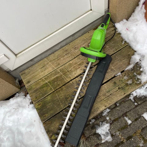 Elektrisk hækkeklipper i grøn farve med lang klinge og frontbøjlegreb for bedre kontrol under arbejdet. Velegnet til trimning og formklipning af hække og buske i haven. Klingen er forsynet med beskyttelsesskede, når maskinen ikke er i brug. Strømkabel tilsluttes almindelig stikkontakt. Egnet til almindelige haveopgaver omkring hus og have.