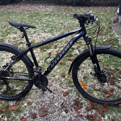 Cannondale mountainbike til unisex med stelstørrelse M og 26" hjul. Den er med aluminiumsstel så den vejer næsten ingenting. Cyklen har affjedret forgaffel og grovmønstrede dæk, som egner sig til kørsel på både grus og lettere terræn. Udstyret med shimano - 24 gear og skivebremser samt standardpedaler. Velegnet som hverdagscykel eller til fritidsbrug på stier og skovveje for både unge og voksne, der passer til en M-stelstørrelse. Se mål af sædehøjden på billedet. Kan sættes yderligere 5 cm ned ved at fjerne bagagebærer. Der medfølger cykellås,-computer,-pumpe,- og drikkedunk.