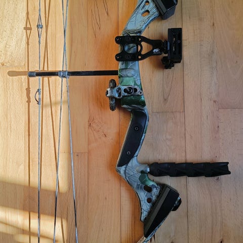 Super fed Jagtbue med helt nye Gas Gas strenge og nyt Hoyt Ultrarest. DL kan indstilles mellem 29-31" og DW er op til 60 Lbs. Side mount Black Gold 3 pin horizontalt jagtsigte. Håndledsaftrækker og bæltehængt pilekogger (Nyt). Kan godt købes som bare bow men foretrækker at sælge samlet. Godt sted at starte for begyndere :)