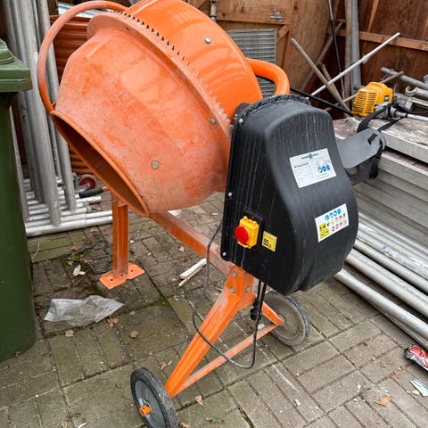 Atika Profi 145 S betonblander. Fritstående tromleblander på stativ med to hjul og håndhjul til drejning af tromlen. Egnet til blanding af beton, mørtel og lignende materialer på byggeplads eller ved mindre byggeprojekter. Drevet af el-motor, tilsluttes 230V strøm. Konstruktion i metal med tromle monteret på stel med støtteben og transporthjul for lettere flytning.
