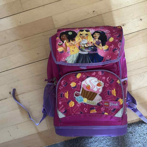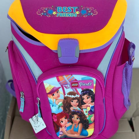 Lego Friends rygsæk til børn i blå med lilla og hestemotiv. Tasken har et hovedrum med lynlås og indvendig navnemærke. Der er yderlomme på forsiden med lynlås. Velegnet som børnehave- eller fritidsrygsæk. Brugt men stadig sød