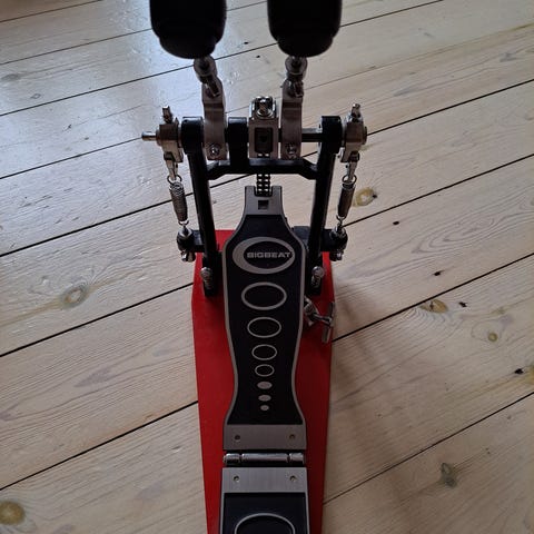 Bigbeat dobbelt stortrommepedal i rød og sort. Sættet består af to pedaler for brug med stortromme, forbundet med aksel. Pedalerne har kædetræk, justerbare fjedre og to køller. Egnet til trommesæt, hvor der ønskes dobbeltpedal-løsning til stortromme.
