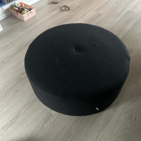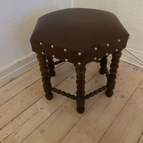 Puffet med oprindeligt betræk. Slidt og det ene ben på den ene puf er lidt løs