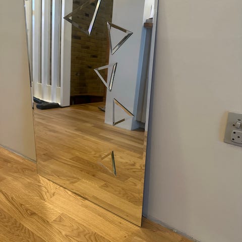 Rektangulært vægspejl i glas. Spejlet har plan, glat overflade og en sort bagside med monteringsbeslag, så det kan hænges op på væg. Egnet til brug på badeværelset