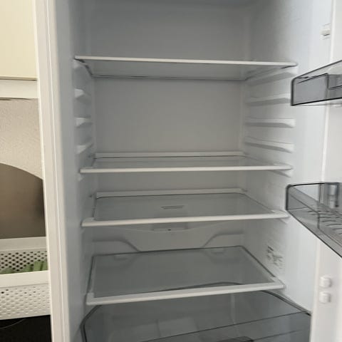 Blomberg køle-fryseskab i stålfinish. Skabet har kølerum øverst med flere hylder og dørhylder til opbevaring af madvarer og drikkevarer.