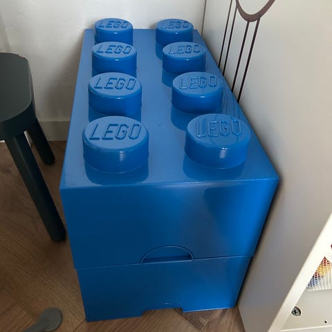 LEGO opbevaringskasser i form af store LEGO-klodser. Sættet består af en blå kasse med låg udformet som en 8-knops LEGO-klods samt to stablebare kasser i gul og grøn, der tilsammen danner en klods med fire knopper på toppen. Kasserne er fremstillet i plast og har indvendigt rum til opbevaring af fx LEGO-klodser eller andet legetøj. De kan stables og bruges som praktisk opbevaringsløsning på børneværelset eller i legeområder.