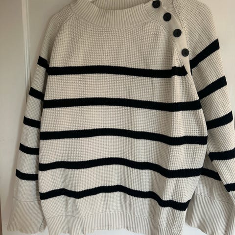 Super fin oversize strik med striber i råhvid og blå. Den fejler intet . Kun været brugt 3 gange da den desværre er blevet for stor . Uden uld .