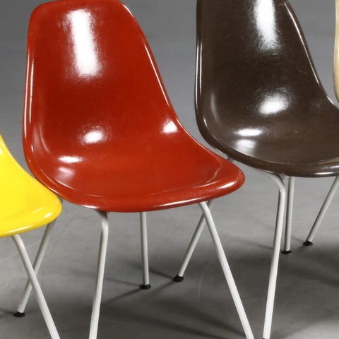 Flot brun skalstol i glasfiber designet af Ray og Charles Eames. Flot farvekombi op mod benene.