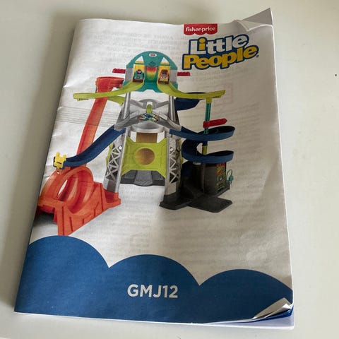 Fisher-Price Little People bilbane legetøj. Stor plastbilbane med flere etager og røde nedkørsler, gul hovedkonstruktion og grå bund. Sættet inkluderer små biler med Little People-figurer, der kan køre ned ad banen.