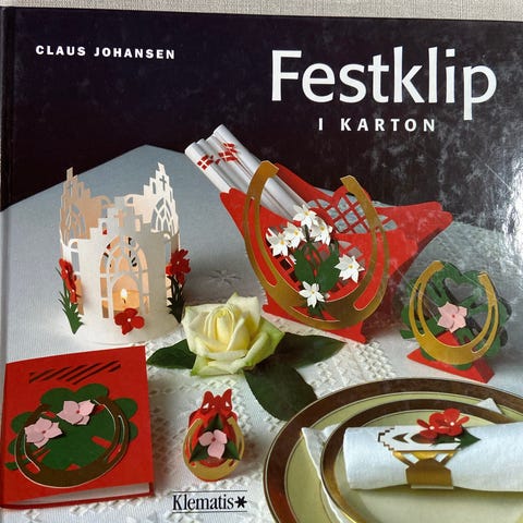Claus Johansen Fine festklip i karton bog med idéer og skabeloner til festlige klip i karton. Bogen viser trin for trin, hvordan man laver dekorationer som bordpynt, lysmanchetter, gavepynt og andre papirudsmykninger til forskellige anledninger. Indeholder farvefotos af færdige projekter samt vejledninger til udskæring og samling af kartonfigurer.