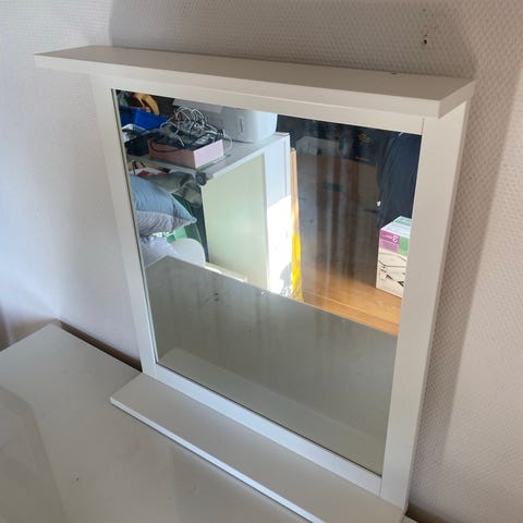 65cmx95 cm rektangulært spejl med dekorativ ramme. Spejlet har en markant, mønstret ramme i en mørk metallisk/bronze-lignende farve, som giver et struktureret udtryk. Det kan bruges stående op ad væggen eller ophængt, afhængigt af beslag på bagsiden. Velegnet til entré, soveværelse eller stue som både funktionelt spejl og dekorativt element i indretningen.