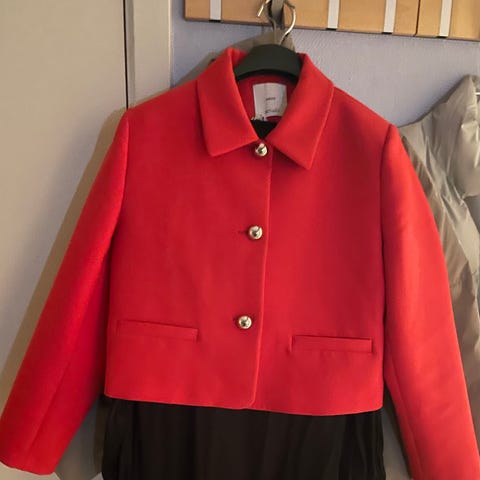 Mango jakke til kvinder i str. M. Jakken er fremstillet i polyester og har et multifarvet vævet mønster i sorte, hvide og beige nuancer. Kort, lige pasform med lange ærmer og rund halsudskæring. Teksturen er kraftig og struktureret, velegnet som let overgangsjakke eller som blazer-lignende jakke til hverdags- og kontorbrug.