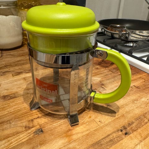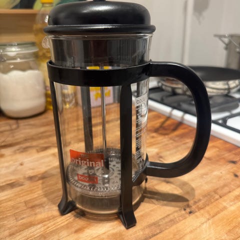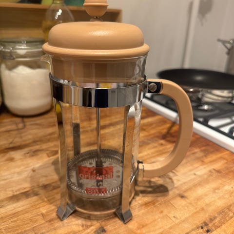 Bodum stempelkande i glas med blå plastlåg og -hank samt metalstel. Kanden har indvendigt stempel med metalfilter til brygning af kaffe eller te. Velegnet til daglig brug i køkkenet til tilberedning af varme drikke.