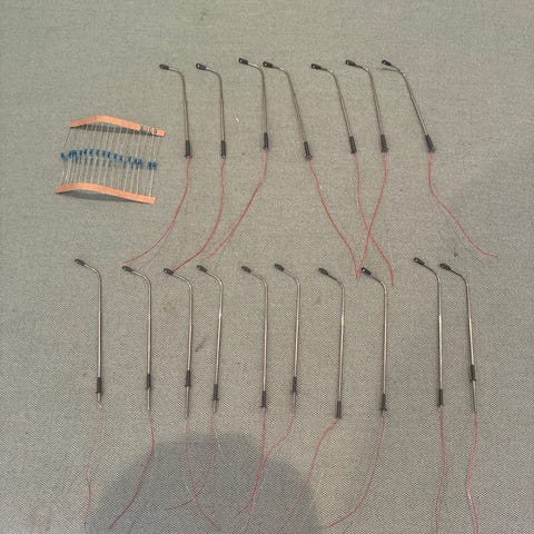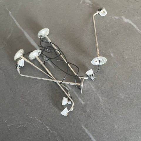 Modelbanelygter i hvid plast med indbygget ledning til tilslutning. Lygterne er udformet som slanke gadelamper, velegnede til brug på modelbaner eller andre miniaturemiljøer, hvor der ønskes belysning langs veje, perroner eller pladser. Antal og mål kan variere efter opstilling og behov.