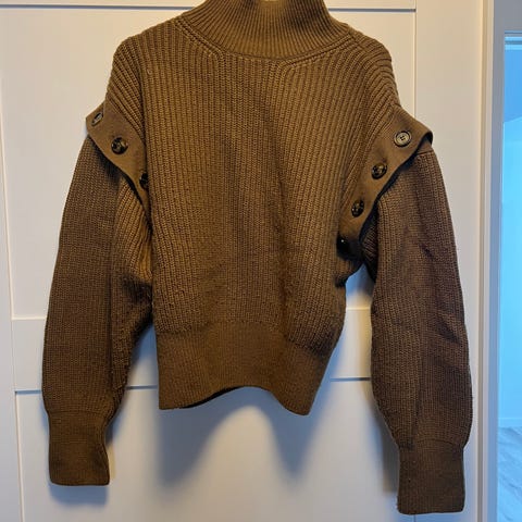 H&M sweater til kvinder i størrelse S. Strikket i akryl i en beige farve. Modellen har strukturstrik med mønster foran og på ærmerne samt voluminøse flæsedetaljer ved skuldrene. Sweateren har lange ærmer og ribkanter ved talje og ærmeafslutninger. Sidder som lidt off shoulder