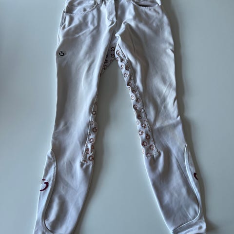 Ridebukser i to farver, hvid og mørkeblå. Bukserne har elastisk materiale og forstærkninger ved knæ og underben. Egnede til ridning og staldarbejde. Velegnede til brug sammen med ridestøvler eller korte støvler med chaps.