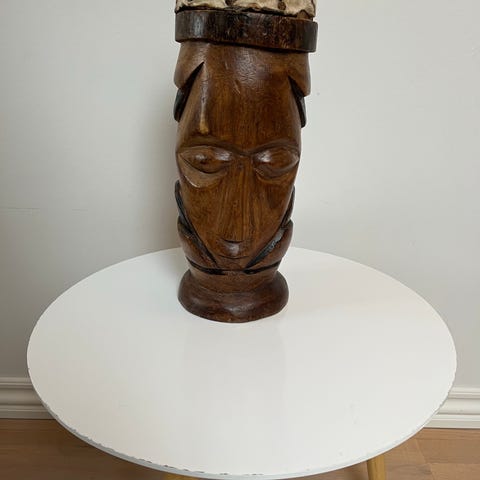 Håndtromme legetøj med motiv på begge trommeskind og rødt skaft. Trommen har to snore med små kugler, der slår mod trommeskindet, når den drejes mellem hænderne. Velegnet som rytmeinstrument til børn eller som dekorativ genstand.