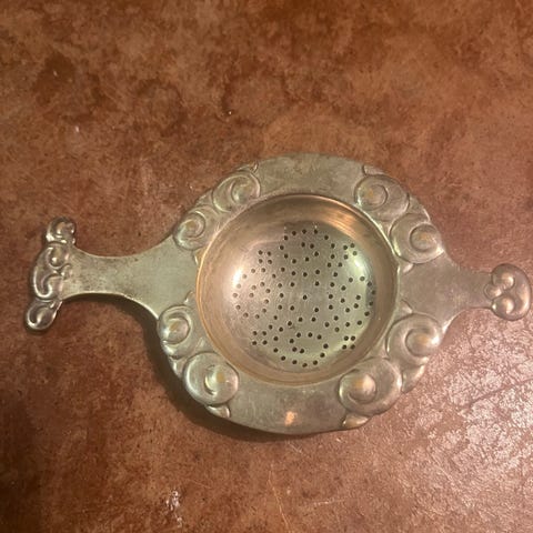 Te-sæt bestående af tekande, glas og rund bakke i metal. Sættet inkluderer en metal-tekande med låg og hank, 2 små glas samt en rund, mønstret metalbakke. Der medfølger en metalholder/stativ, som også kan bruges til dekoration med diverse olier og krydderurter. Indersiden af kanden viser brugsspor og bør rengøres efter behov før brug.