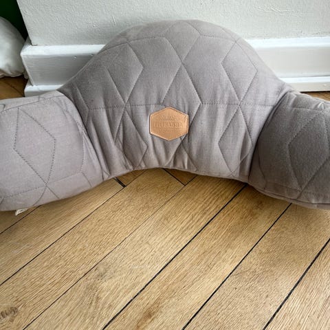 Filibabba barnevognspude i grå/brun farve. Puden har høj ryg og to brede armlæn, som giver støtte omkring kroppen.