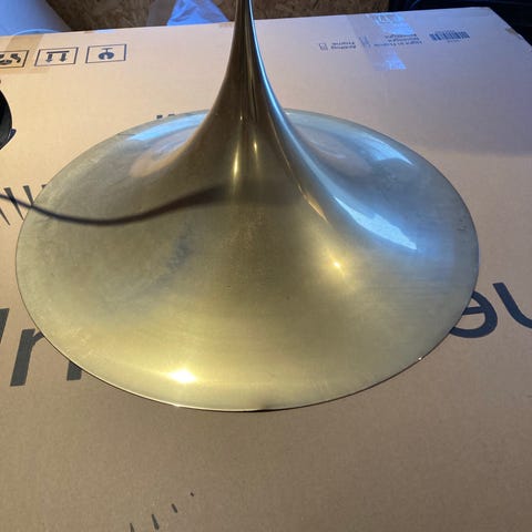Trompetlampe hvor noget belægningen er slidt af. Har en bule