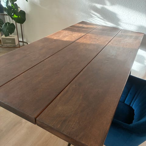 Plankebord i lys egelook Årsag til outlet: Bordet er fra vores showroom og derfor uden emballage. Der er let snavs på bordoverflade, underside samt ben. Dette spisebord kombinerer et elegant design med en rå og naturlig udstråling, der giver din spisestue et både moderne og tidløst udtryk. Bordpladen er udført i melamin med et smukt vild ege-look, som fremhæver træets naturlige spil og varme toner. Det skaber en flot kontrast til de robuste ben i sort, pulverlakeret stål, der giver bordet et industrielt præg og en solid stabilitet. Kombinationen af materialer gør bordet både stilfuldt og praktisk i hverdagen. Melaminoverfladen er ru i strukturen, hvilket giver en autentisk fornemmelse af træ og samtidig gør bordet nemt at vedligeholde. Det kræver blot en fugtig klud for at holde overfladen ren og pæn. Med en bordpladetykkelse på 38 mm fremstår bordet massivt og indbydende, perfekt til hyggelige måltider og sociale sammenkomster. Bordets benhøjde på 71,2 cm sikrer god siddekomfort, mens afstanden mellem benene på 109 cm giver rigelig plads til stole og benfri bevægelse. Den frihøjde på 71,2 cm gør det muligt at bruge de fleste spisebordsstole uden begrænsninger. Dette spisebord er det ideelle valg for dig, der ønsker et møbel, der kombinerer funktionalitet, holdbarhed og et design, der kan passe ind i både moderne og klassiske indretninger.